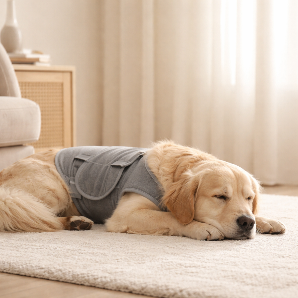 The vest is adjustable and designed to fit a wide range of dog sizes and shapes. It can be used during everyday activities or before known stress triggers like storms, travel, or separation.